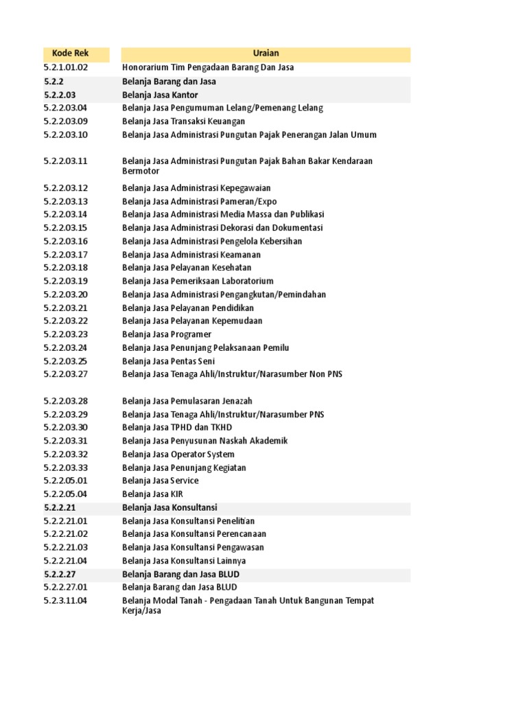 KODE REKENING BELANJA KODE REKENING URAIAN PENJELASAN REKENING BELANJA DAERAH BELANJA TIDAK LANGSUNG Tunjangan Beras Untuk menampung pengeluaran atas pemberian Tunjangan Beras kepada PNSCPNS sesuai dengan peraturan yang berlaku. 1 Belanja Modal Peralatan dan Mesin - Pengadaan Alat Ukur 28350000 2 Belanja Modal Peralatan dan Mesin - Pengadaan Alat Kantor 7900000 3 Belanja Modal Peralatan dan Mesin - Pengadaan Komputer 26470000 4 Belanja Modal Peralatan dan Mesin - Pengadaan Meja Dan Kursi KerjaRapat. Pengeluaran untuk membiayai keperluan sehari-hari perkantoran yang secara langsung menunjang.